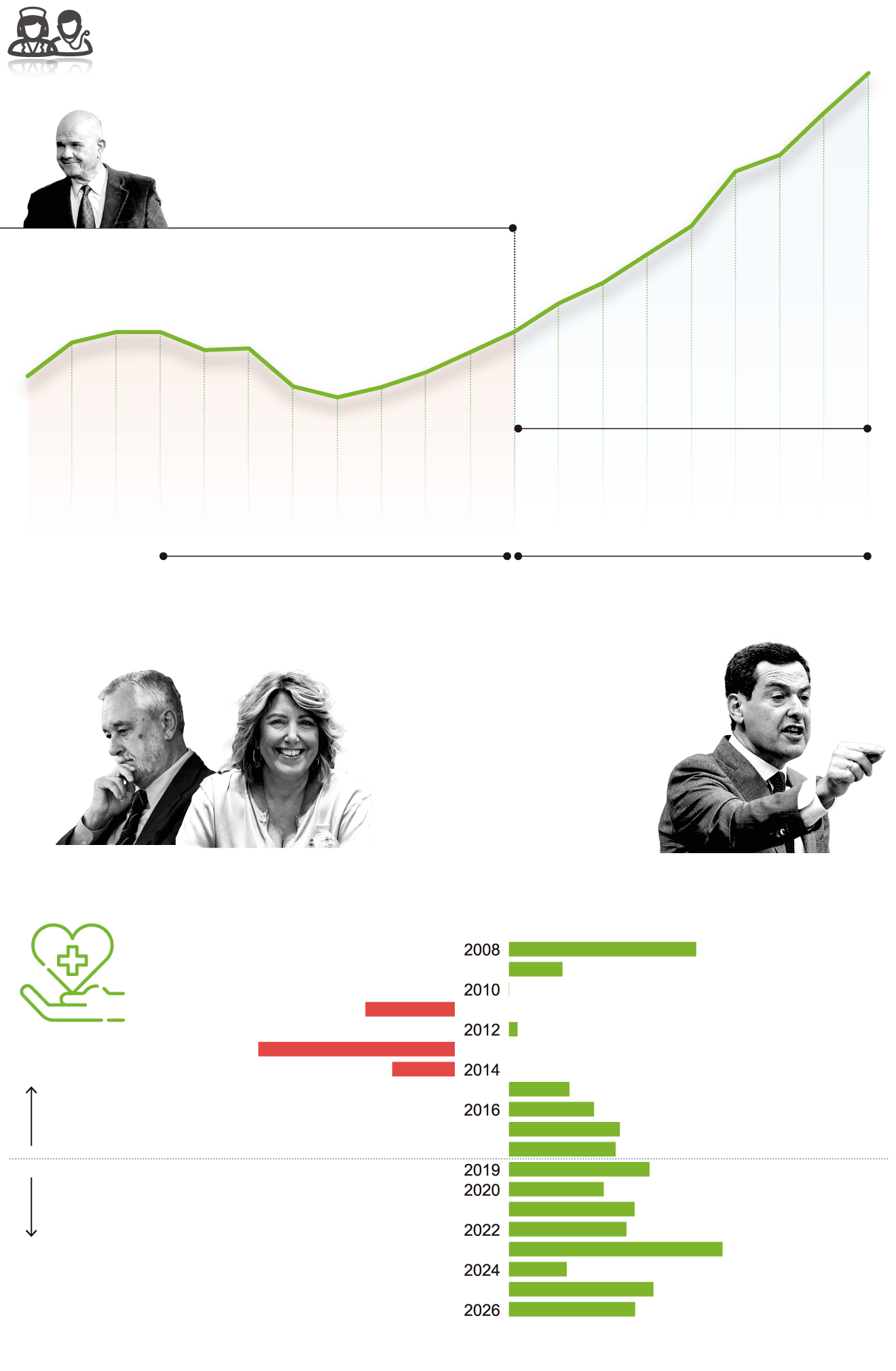 Esa era terrible donde la curva descendente se convierte en un socavón es la única en este milenio en el que no sólo no se aumenta el presupuesto, ni siquiera se congela. Se reduce, se recorta. De ahí que desde la Junta respondan a los ataques socialistas con los movimientos que ese mismo partido realizó hace apenas una década y que todavía es pronto para olvidar. Los gobiernos, de Griñán primero y Susana Díaz después, «recortaron el presupuesto, expulsaron a 7.773 profesionales sanitarios, eliminaron 800 camas y guardaron a 500.000 andaluces en los cajones para que no subieran las listas de espera», recuerda la portavoz Carolina España.