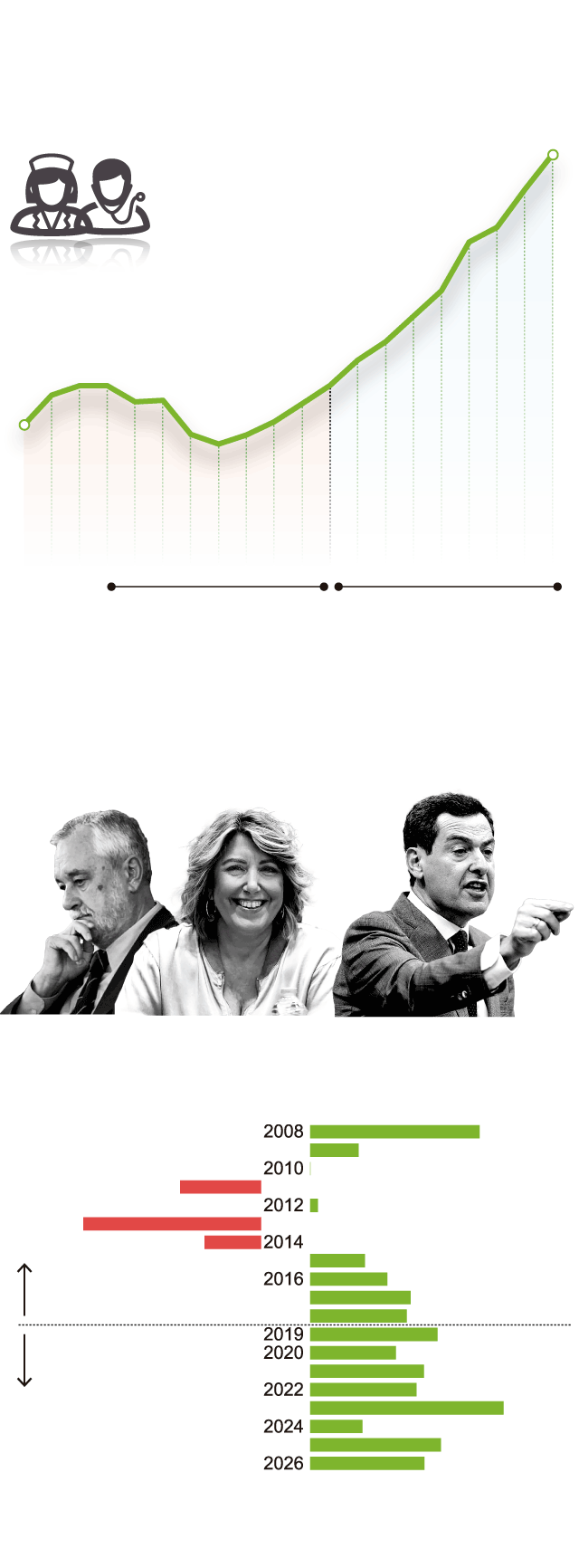 Esa era terrible donde la curva descendente se convierte en un socavón es la única en este milenio en el que no sólo no se aumenta el presupuesto, ni siquiera se congela. Se reduce, se recorta. De ahí que desde la Junta respondan a los ataques socialistas con los movimientos que ese mismo partido realizó hace apenas una década y que todavía es pronto para olvidar. Los gobiernos, de Griñán primero y Susana Díaz después, «recortaron el presupuesto, expulsaron a 7.773 profesionales sanitarios, eliminaron 800 camas y guardaron a 500.000 andaluces en los cajones para que no subieran las listas de espera», recuerda la portavoz Carolina España.